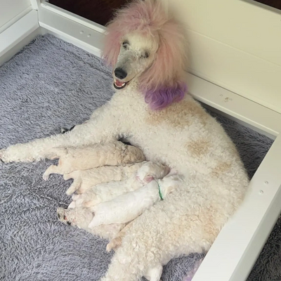 Meet Lou, the charming white and cream parti poodle mom who embodies love and warmth. As a first-time mother, she has taken to her role with grace and enthusiasm, nurturing her adorable puppies with gentle care. Tallulah is exceptionally great with kids, always ready to play and cuddle, making her a favorite among the little ones.